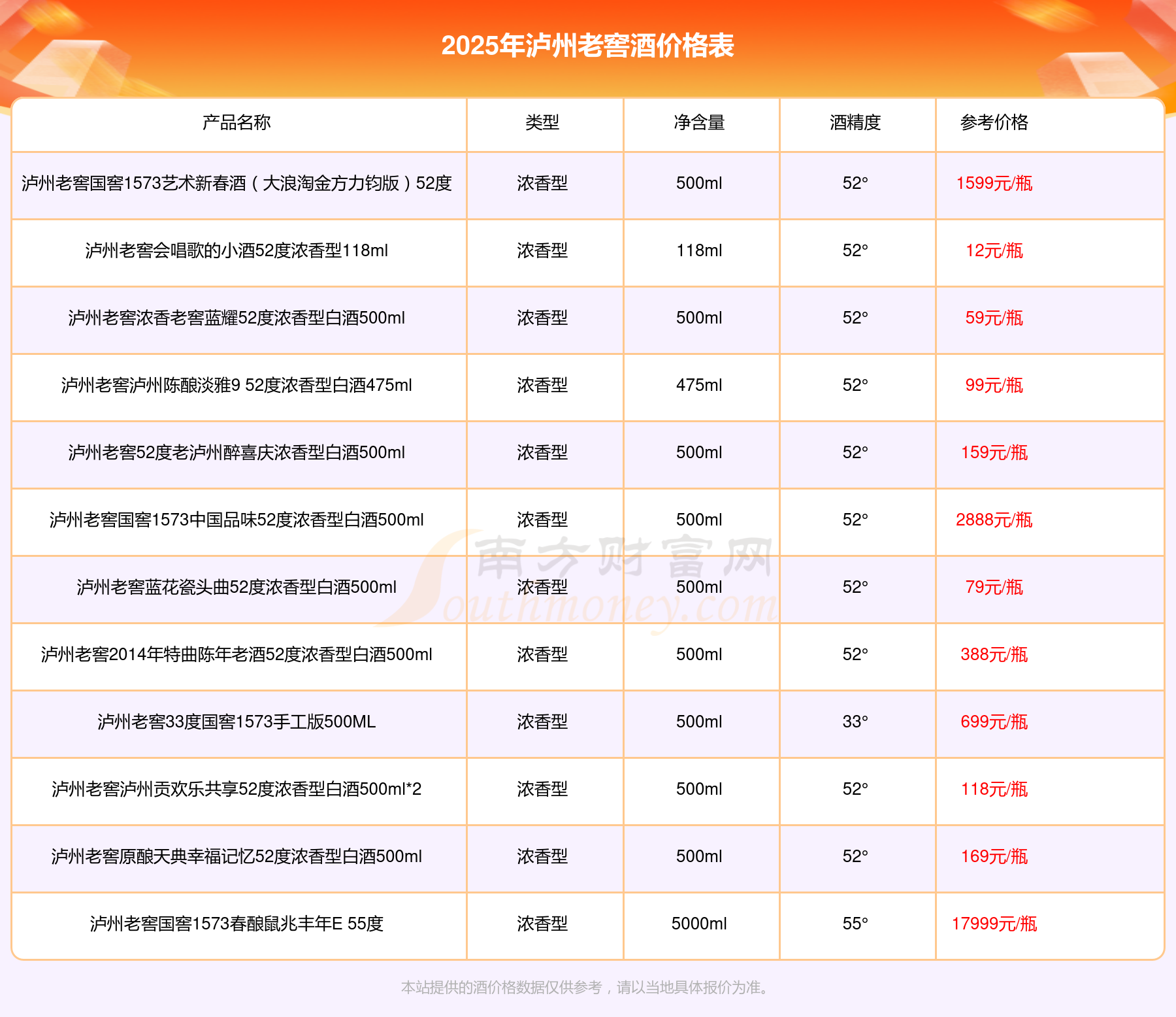 2025泸州老窖酒最新价格:泸州老窖国窖1573春酿鼠兆丰年E 55度参考价17999元/瓶、泸州老窖国窖1573生命中的那坛酒55度014参考价9999元/瓶、泸州老窖国窖1573春酿鼠兆丰年A 55度参考价5088元/瓶、泸州老窖国窖1573生命中的那坛酒55度013浓香型白酒1000ml参考价4988元/瓶。