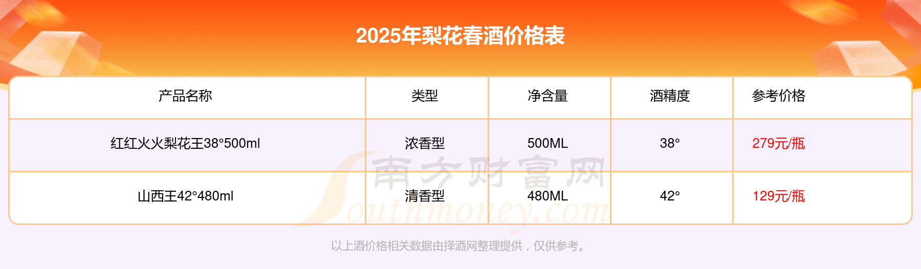 2025年梨花春价格最高的酒是红红火火梨花王38°500ml,参考价279元/瓶,最低的是山西王42°480ml,参考价129元/瓶,价格高低差为150元/瓶。