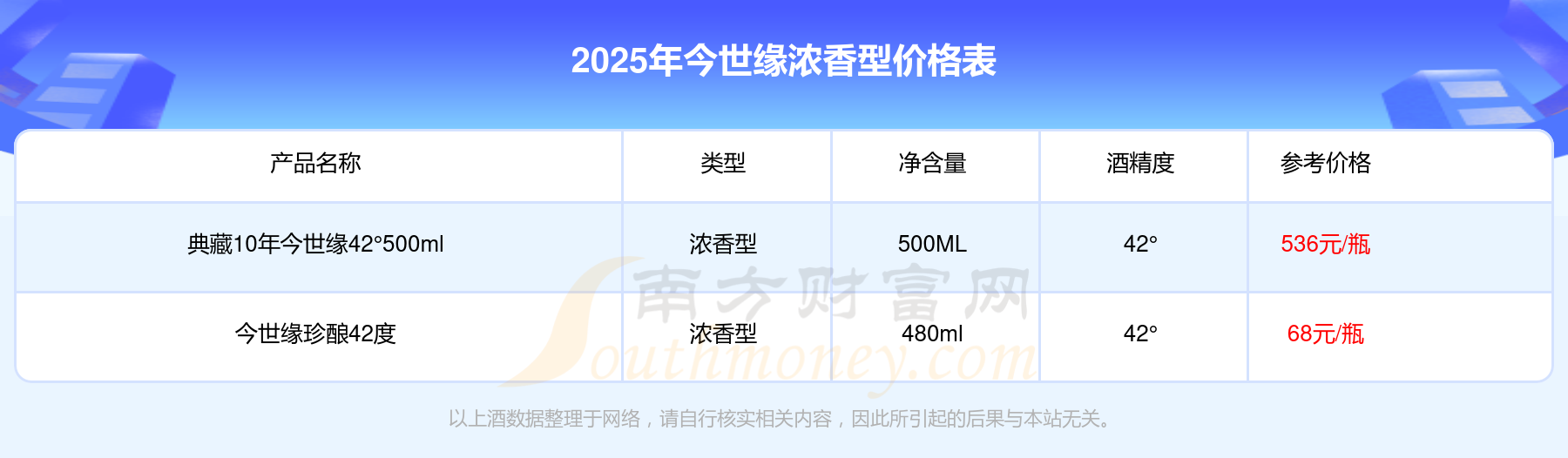 2025年,典藏10年今世缘42°500ml、今世缘珍酿42度等今世缘浓香型酒价格如下: