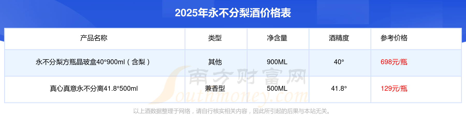 2025年,永不分梨方瓶晶玻盒40°900ml(含梨)、真心真意永不分离41.8°500ml等永不分梨酒价格如下:永不分梨方瓶晶玻盒40°900ml(含梨)参考价698元/瓶、真心真意永不分离41.8°500ml参考价129元/瓶。