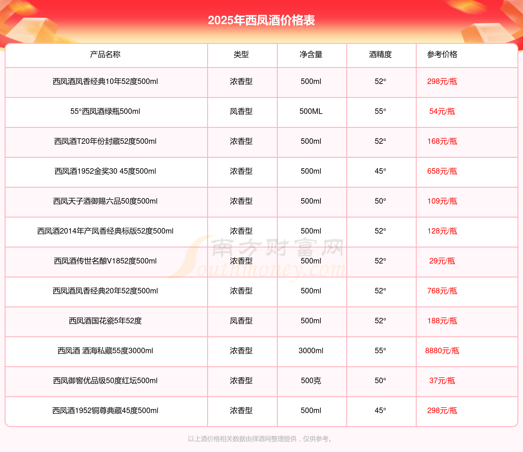 2025年,西凤酒 酒海私藏55度3000ml、西凤酒1952金奖50 55度500ml、西凤酒2013年产老酒凤香经典30年52度500ml、西凤酒1956钻石藏45度500ml等西凤酒价格如下: