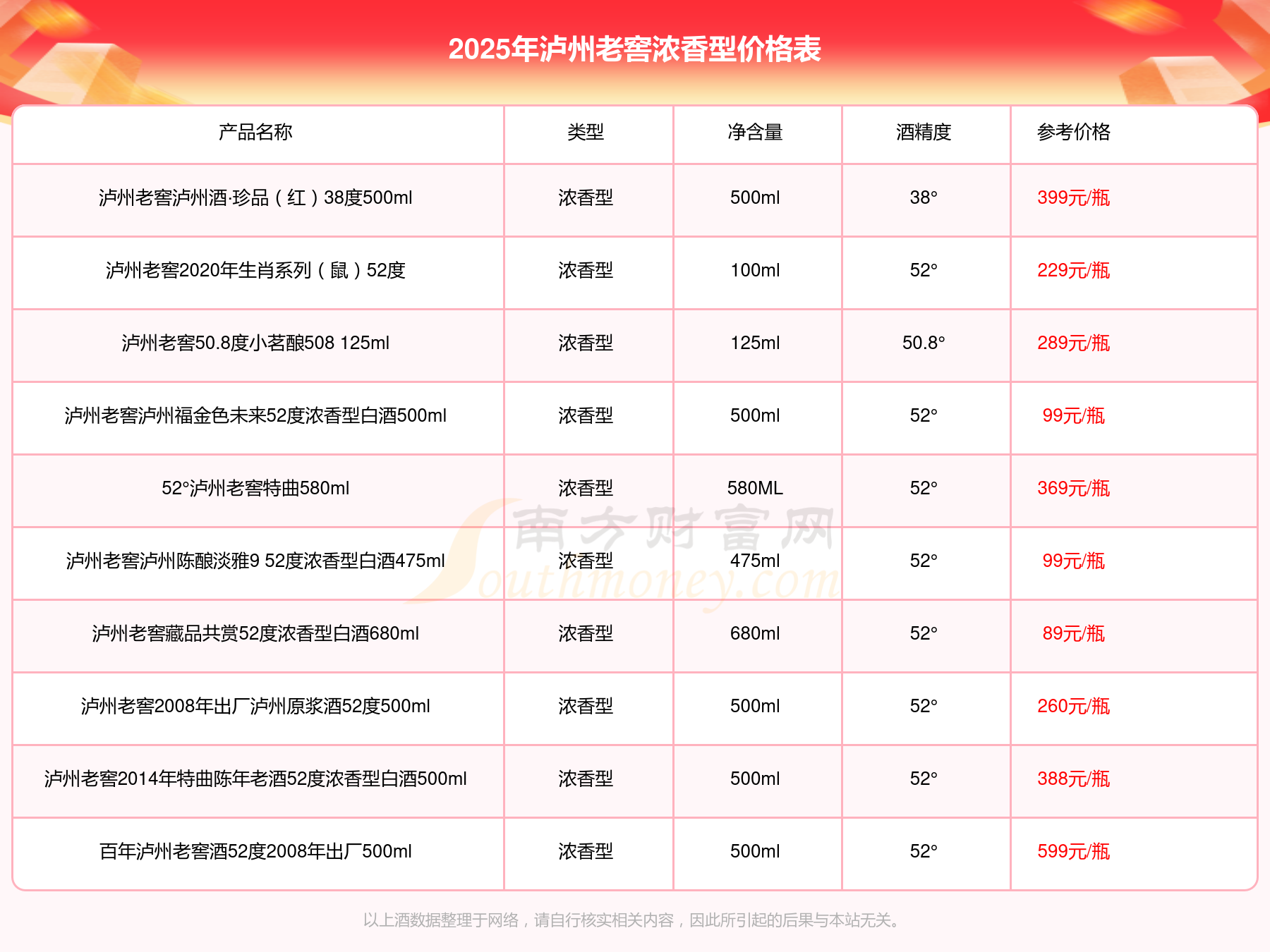 2025年,泸州老窖国窖1573春酿鼠兆丰年E 55度、泸州老窖国窖1573生命中的那坛酒55度014、泸州老窖国窖1573春酿鼠兆丰年A 55度、泸州老窖国窖1573生命中的那坛酒55度013浓香型白酒1000ml、泸州老窖国窖1573生命中的那坛酒55度009 1000ml、泸州老窖国窖1573中国品味52度浓香型白酒500ml等泸州老窖浓香型酒价格如下: