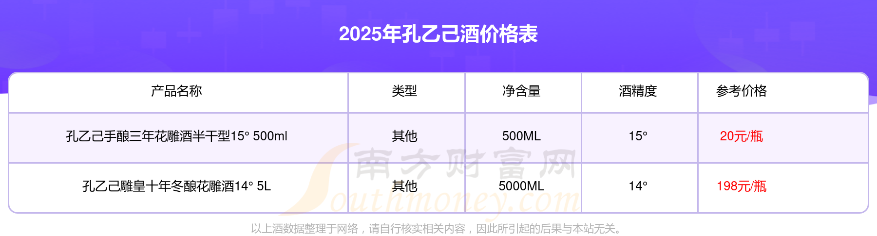 孔乙己雕皇十年冬酿花雕酒14° 5L参考价198元/瓶、孔乙己手酿三年花雕酒半干型15° 500ml参考价20元/瓶。