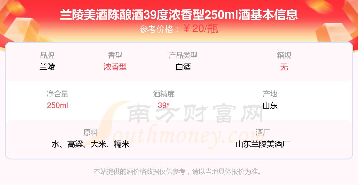 兰陵美酒陈酿酒39度浓香型250ml基本信息