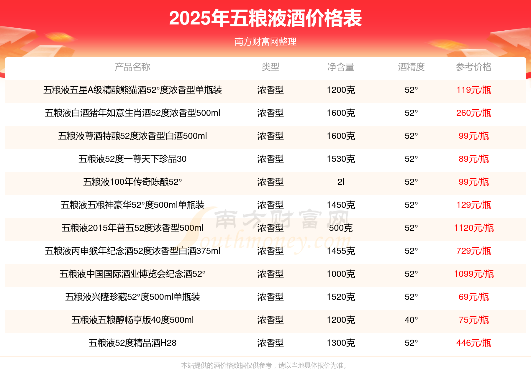 五粮液酒价格最高的是五粮液百年世博世纪荣耀纪念酒60°999ml,参考价26980元/瓶,最低的是五粮液干一杯小瓶46度,参考价16元/瓶,价格高低差为26964元/瓶。