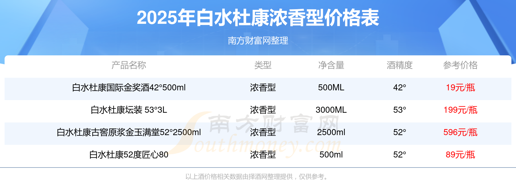2025年白水杜康浓香型酒白水杜康古窖原浆金玉满堂52°2500ml、白水杜康坛装 53°3L、白水杜康52度匠心80、白水杜康国际金奖酒42°500ml等最新价格如下:白水杜康古窖原浆金玉满堂52°2500ml参考价596元/瓶、白水杜康坛装 53°3L参考价199元/瓶、白水杜康52度匠心80参考价89元/瓶、白水杜康国际金奖酒42°500ml参考价19元/瓶。