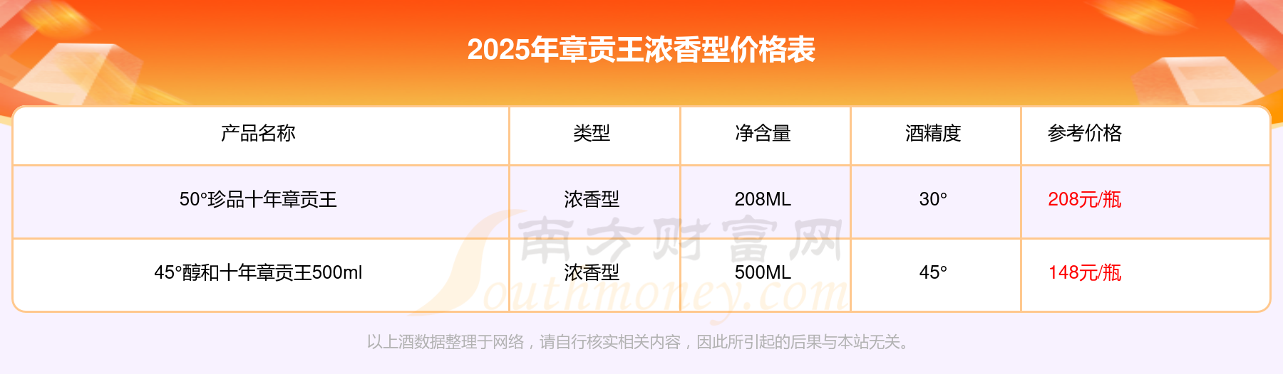 2025章贡王浓香型酒最新价格:50°珍品十年章贡王参考价208元/瓶、45°醇和十年章贡王500ml参考价148元/瓶。