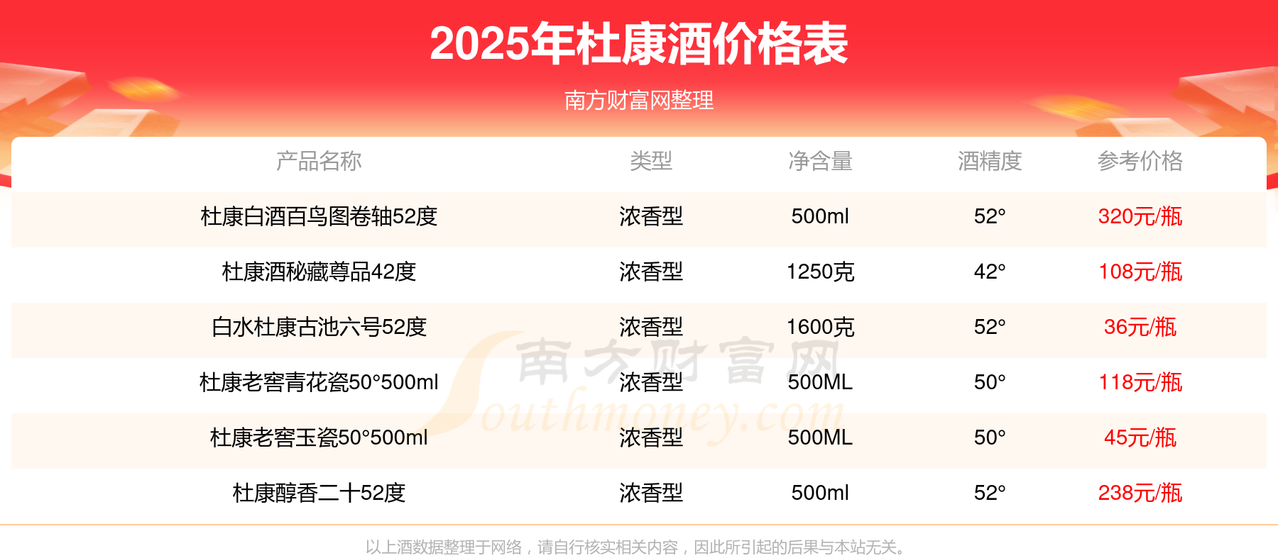 2025年杜康酒杜康白酒百鸟图卷轴52度、杜康醇香二十52度、杜康老窖青花瓷50°500ml、杜康酒秘藏尊品42度、杜康老窖玉瓷50°500ml、白水杜康古池六号52度等最新价格如下:杜康白酒百鸟图卷轴52度参考价320元/瓶、杜康醇香二十52度参考价238元/瓶、杜康老窖青花瓷50°500ml参考价118元/瓶、杜康酒秘藏尊品42度参考价108元/瓶、杜康老窖玉瓷50°500ml参考价45元/瓶、白水杜康古池六号52度参考价36元/瓶。
