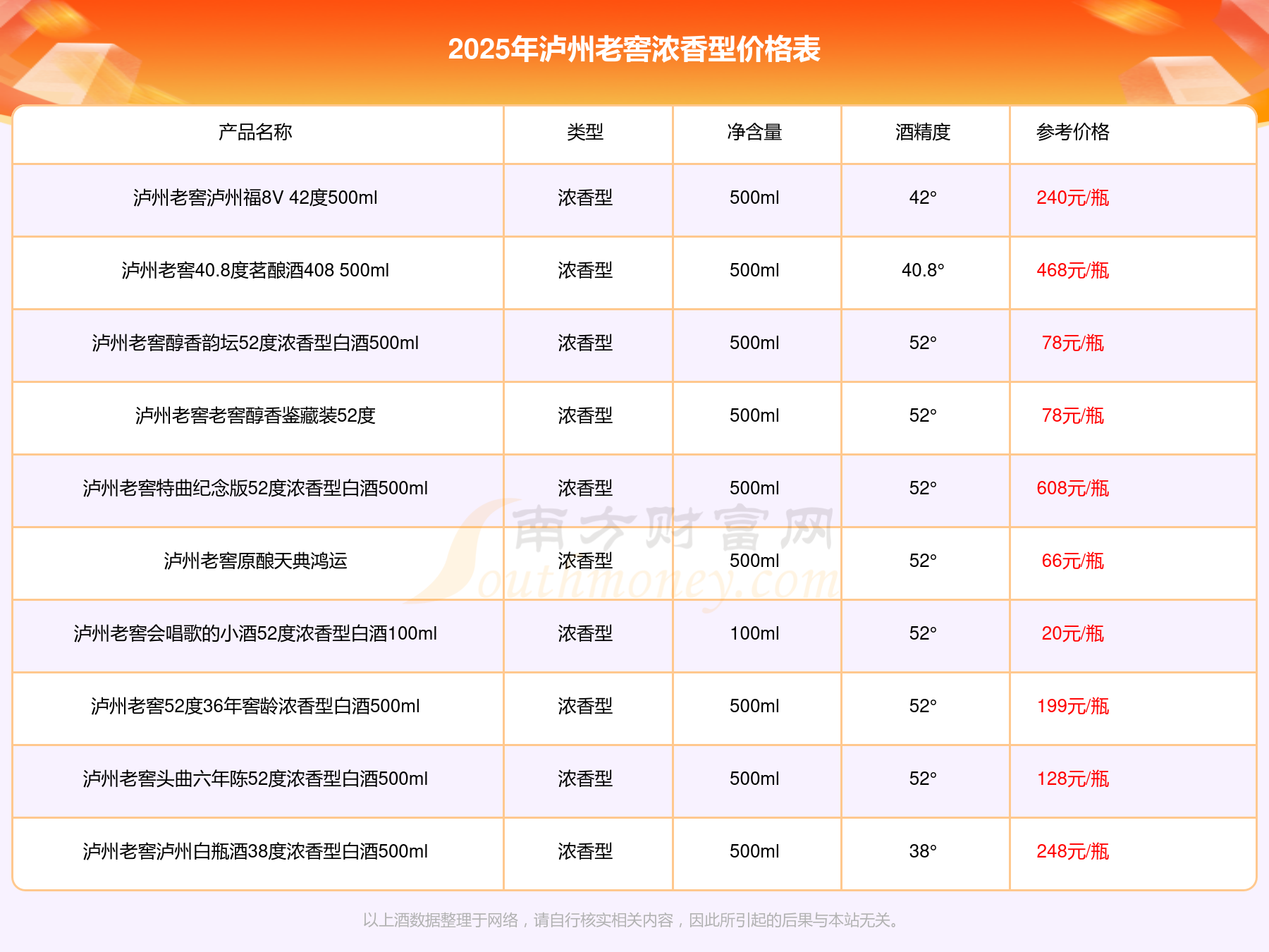 泸州老窖浓香型酒价格最高的是泸州老窖国窖1573春酿鼠兆丰年E 55度,参考价17999元/瓶,最低的是泸州老窖45度五洲醉8窖经典小酒版浓香型100ml,参考价10元/瓶,价格高低差为17989元/瓶。