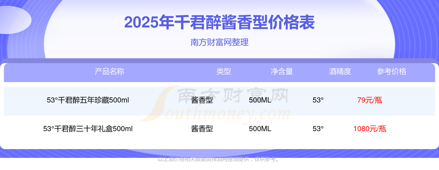 千君醉酱香型酒最新价格2025:53°千君醉三十年礼盒500ml参考价1080元/瓶、53°千君醉五年珍藏500ml参考价79元/瓶。