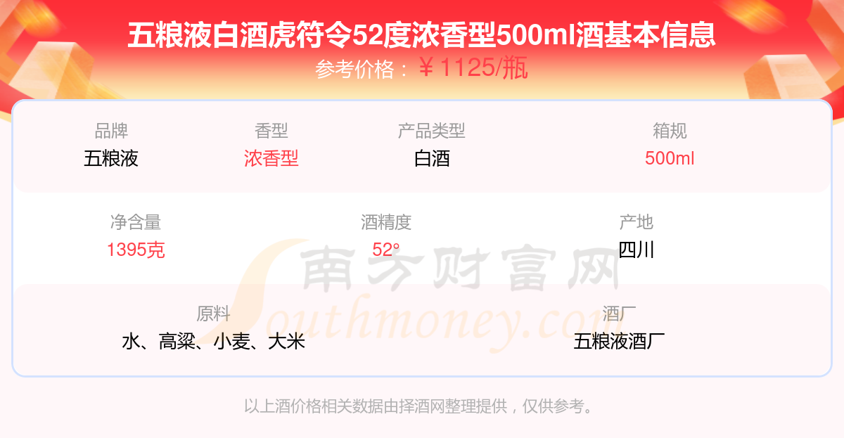 五粮液白酒虎符令52度浓香型500ml基本信息