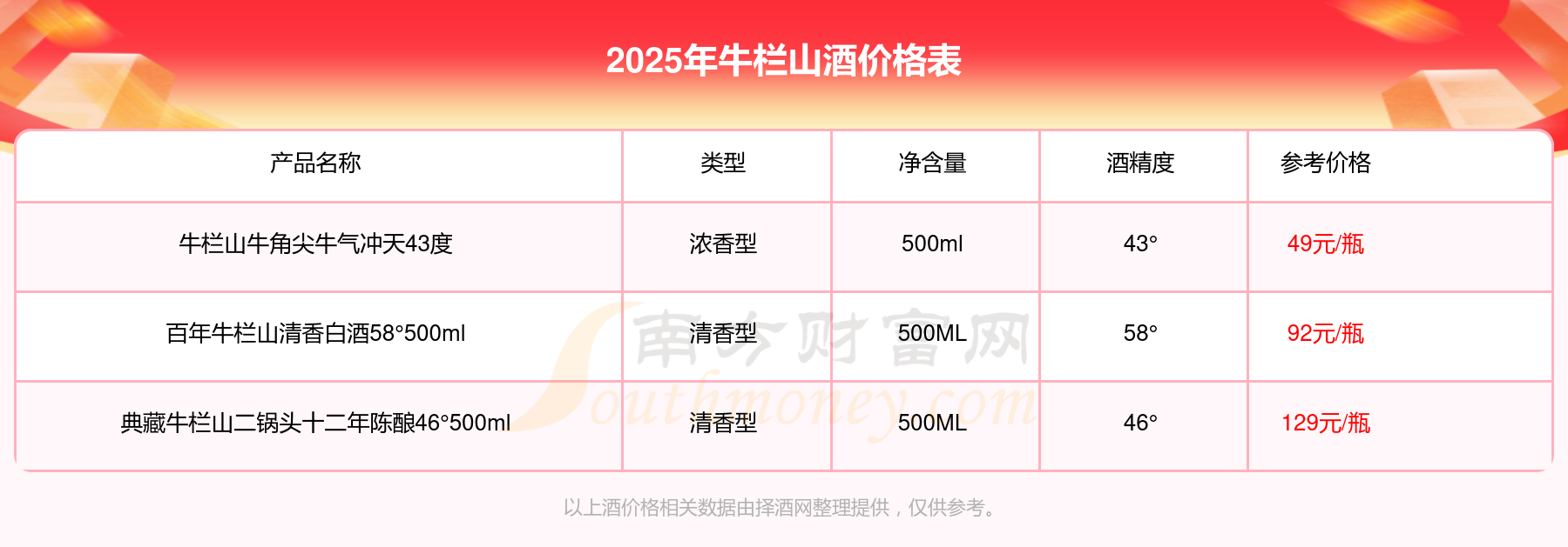 典藏牛栏山二锅头十二年陈酿46°500ml参考价129元/瓶、百年牛栏山清香白酒58°500ml参考价92元/瓶、牛栏山牛角尖牛气冲天43度参考价49元/瓶。