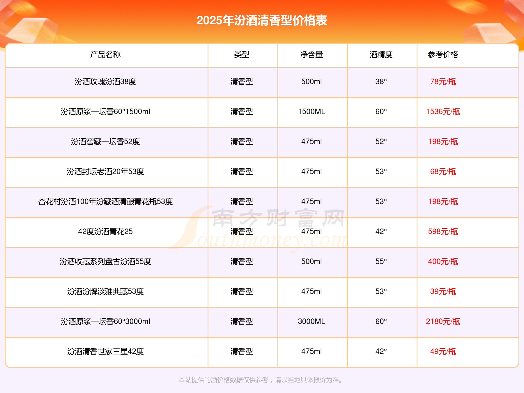 2025年,汾酒清香型酒价格最高的是汾酒原浆一坛香60°3000ml,参考价2180元,最低的是汾酒百年汾杏酒纯酿53度,参考价28元,价格高低差为2152元。