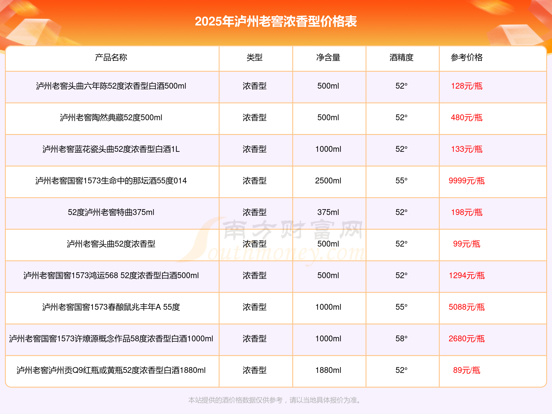 2025年,泸州老窖国窖1573春酿鼠兆丰年E 55度、泸州老窖国窖1573生命中的那坛酒55度014、泸州老窖国窖1573春酿鼠兆丰年A 55度、泸州老窖国窖1573生命中的那坛酒55度013浓香型白酒1000ml等泸州老窖浓香型酒价格如下:泸州老窖国窖1573春酿鼠兆丰年E 55度参考价17999元/瓶、泸州老窖国窖1573生命中的那坛酒55度014参考价9999元/瓶、泸州老窖国窖1573春酿鼠兆丰年A 55度参考价5088元/瓶、泸州老窖国窖1573生命中的那坛酒55度013浓香型白酒1000ml参考价4988元/瓶。