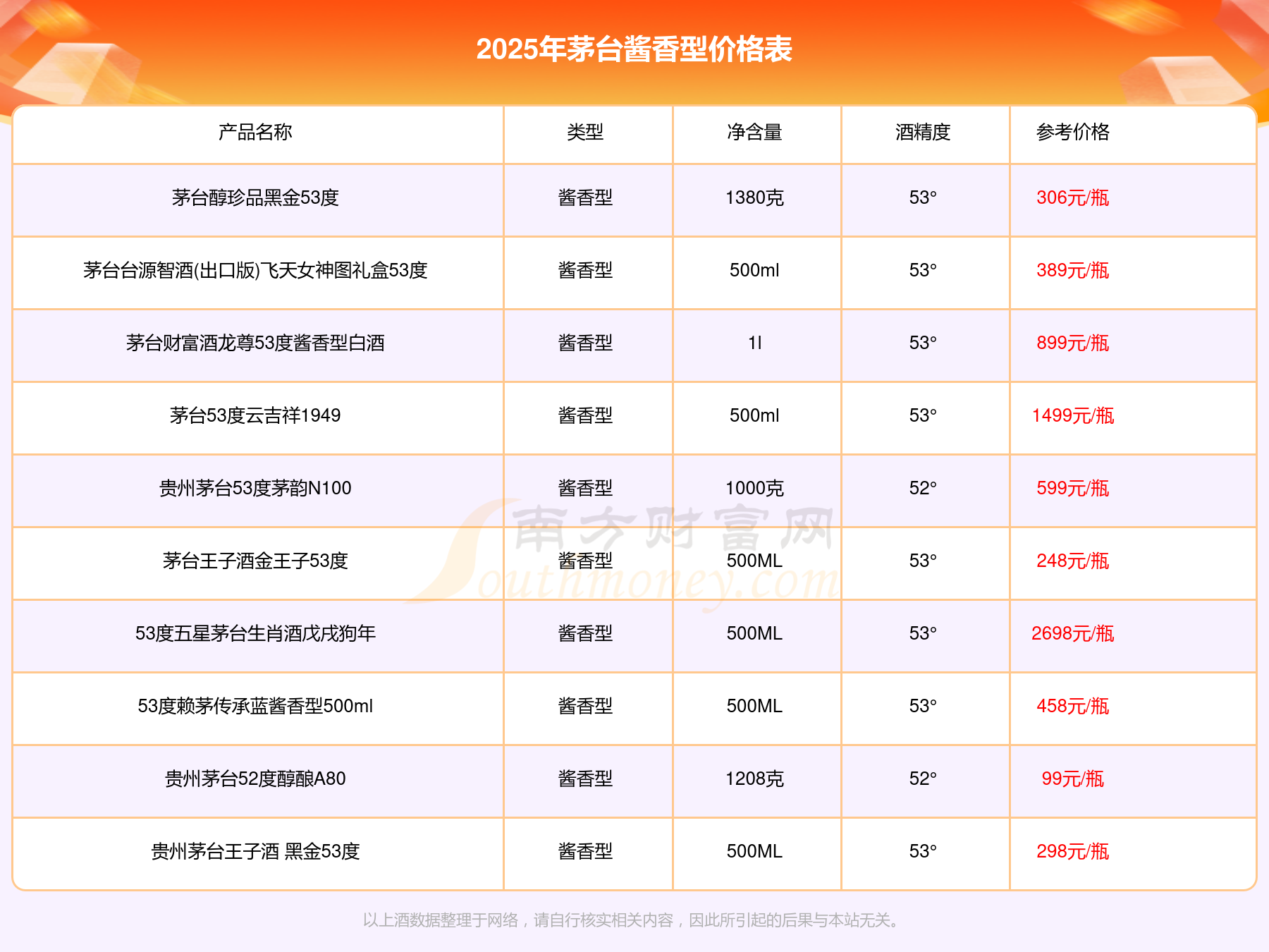 茅台酱香型酒最新价格2025:华茅鉴藏 酱香型白酒 3L 53°参考价8388元/瓶、53度五星茅台生肖酒丁酉鸡年参考价2798元/瓶、贵州茅台己亥猪年生肖酒53°500ml参考价2699元/瓶、53度五星茅台生肖酒戊戌狗年参考价2698元/瓶、飞天茅台53°500ml(2015年)参考价2199元/瓶、茅台王子酒己亥猪年生肖纪念酒53度2.5L参考价2099元/瓶、茅台1935酱香型53度参考价1799元/瓶。