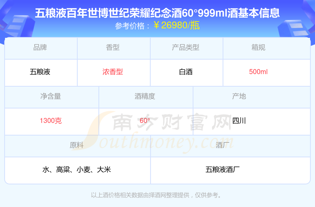 五粮液百年世博世纪荣耀纪念酒60°999ml基本信息