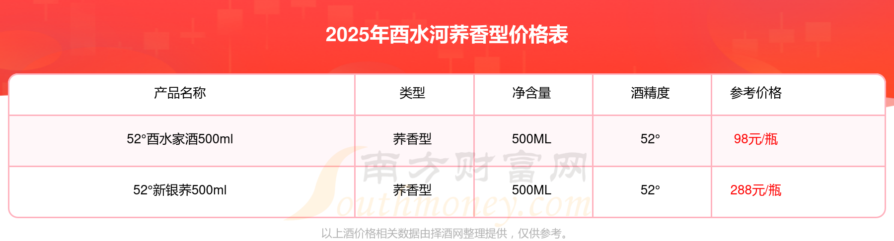 52°新银荞500ml参考价288元/瓶、52°酉水家酒500ml参考价98元/瓶。