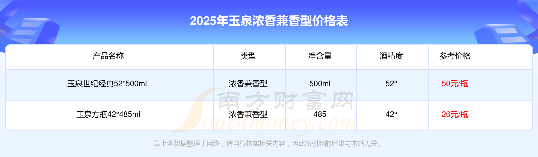 玉泉浓香兼香型酒最新价格2025:玉泉世纪经典52°500mL参考价50元/瓶、玉泉方瓶42°485ml参考价26元/瓶。