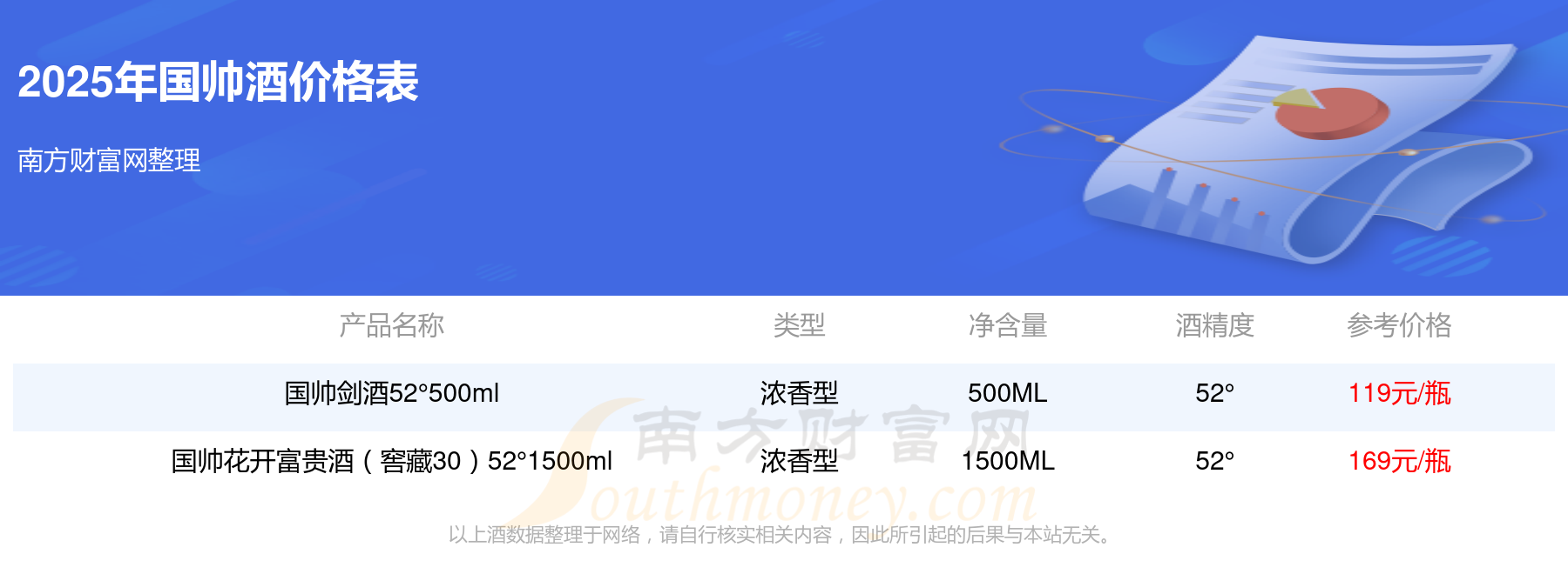 2025年,国帅花开富贵酒(窖藏30)52°1500ml、国帅剑酒52°500ml等国帅酒价格如下:国帅花开富贵酒(窖藏30)52°1500ml参考价169元/瓶、国帅剑酒52°500ml参考价119元/瓶。