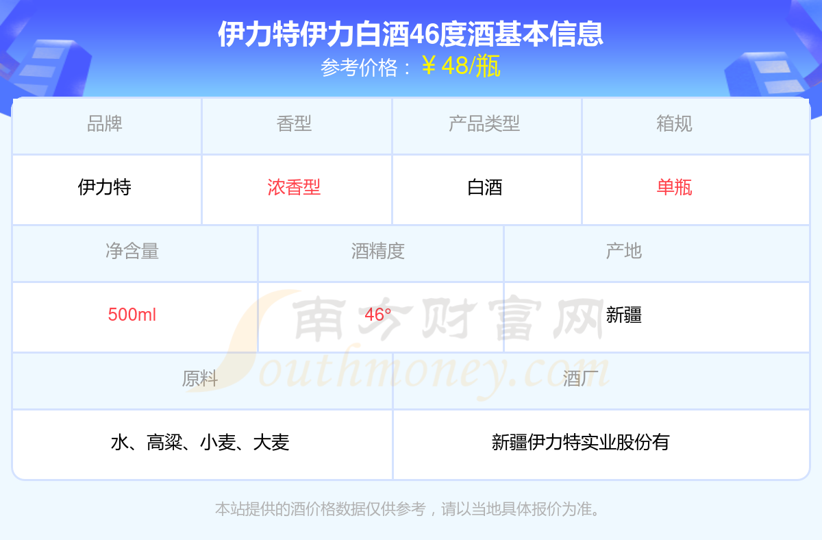 “伊力”牌系列白酒是用天山雪水、伊犁河谷优质高粱、小麦、大米、玉米和豌豆五种粮食为原料,经陈年老窖发酵,长年陈酿,精心勾兑而成。它以“香气悠久、味醇厚、入口甘美、入喉净爽、诸味谐调、酒味全面”的独特风格闻名疆内外,被誉为“新疆第一酒”。公司经过近半个世纪的发展,现已成为中国白酒工业百强企业,中国白酒工业经济效益十佳企业。