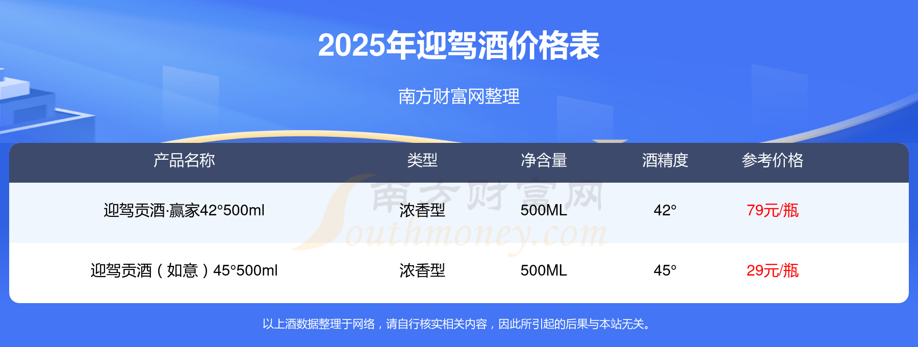 迎驾贡酒·赢家42°500ml参考价79元/瓶、迎驾贡酒(如意)45°500ml参考价29元/瓶。