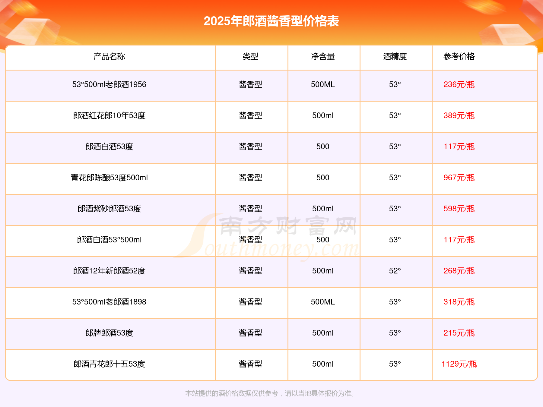 2025郎酒酱香型酒最新价格:郎酒青花郎十五53度参考价1129元/瓶、青花郎陈酿53度500ml参考价967元/瓶、郎酒紫砂郎酒53度参考价598元/瓶、郎酒红花郎10年53度参考价389元/瓶、53°500ml老郎酒1898参考价318元/瓶、郎酒12年新郎酒52度参考价268元/瓶、53°500ml老郎酒1956参考价236元/瓶。