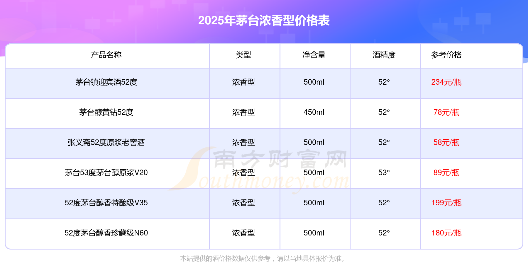 2025年茅台浓香型酒茅台镇迎宾酒52度、52度茅台醇香特酿级V35、52度茅台醇香珍藏级N60、茅台53度茅台醇原浆V20等最新价格如下:茅台镇迎宾酒52度参考价234元/瓶、52度茅台醇香特酿级V35参考价199元/瓶、52度茅台醇香珍藏级N60参考价180元/瓶、茅台53度茅台醇原浆V20参考价89元/瓶。