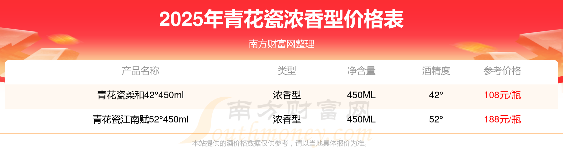 2025青花瓷浓香型酒最新价格:青花瓷江南赋52°450ml参考价188元/瓶、青花瓷柔和42°450ml参考价108元/瓶。