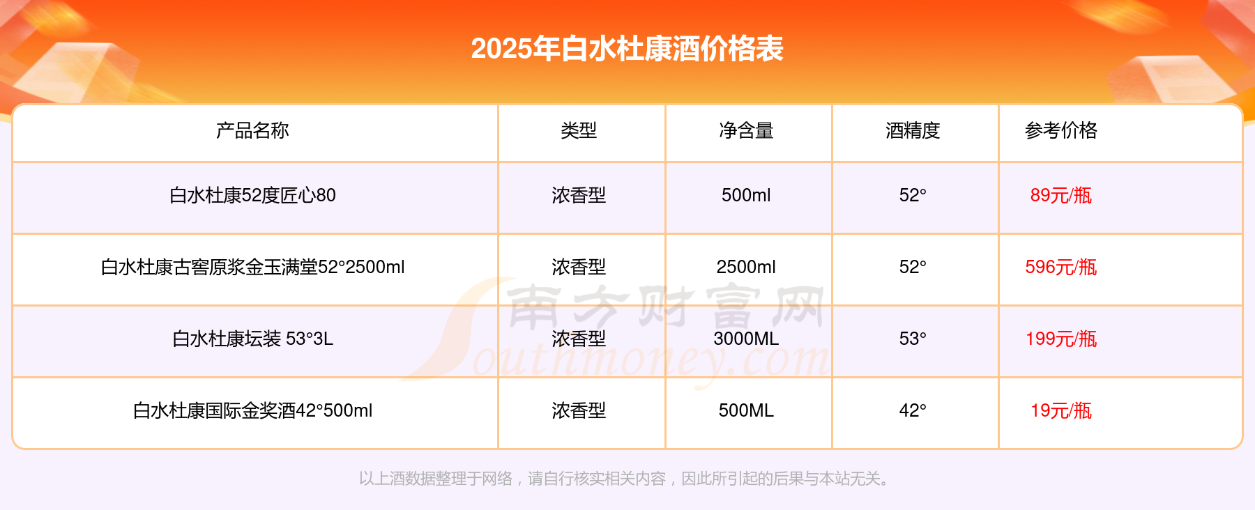 白水杜康古窖原浆金玉满堂52°2500ml参考价596元/瓶、白水杜康坛装 53°3L参考价199元/瓶、白水杜康52度匠心80参考价89元/瓶、白水杜康国际金奖酒42°500ml参考价19元/瓶。