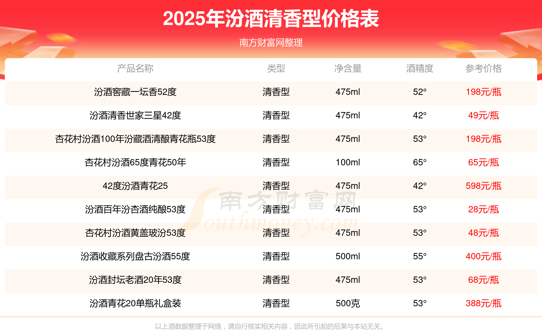 2025年,汾酒原浆一坛香60°3000ml、汾酒原浆一坛香60°1500ml、42度汾酒青花25、汾酒收藏系列盘古汾酒55度、汾酒关照原浆60度、汾酒青花20单瓶礼盒装等汾酒清香型酒价格如下: