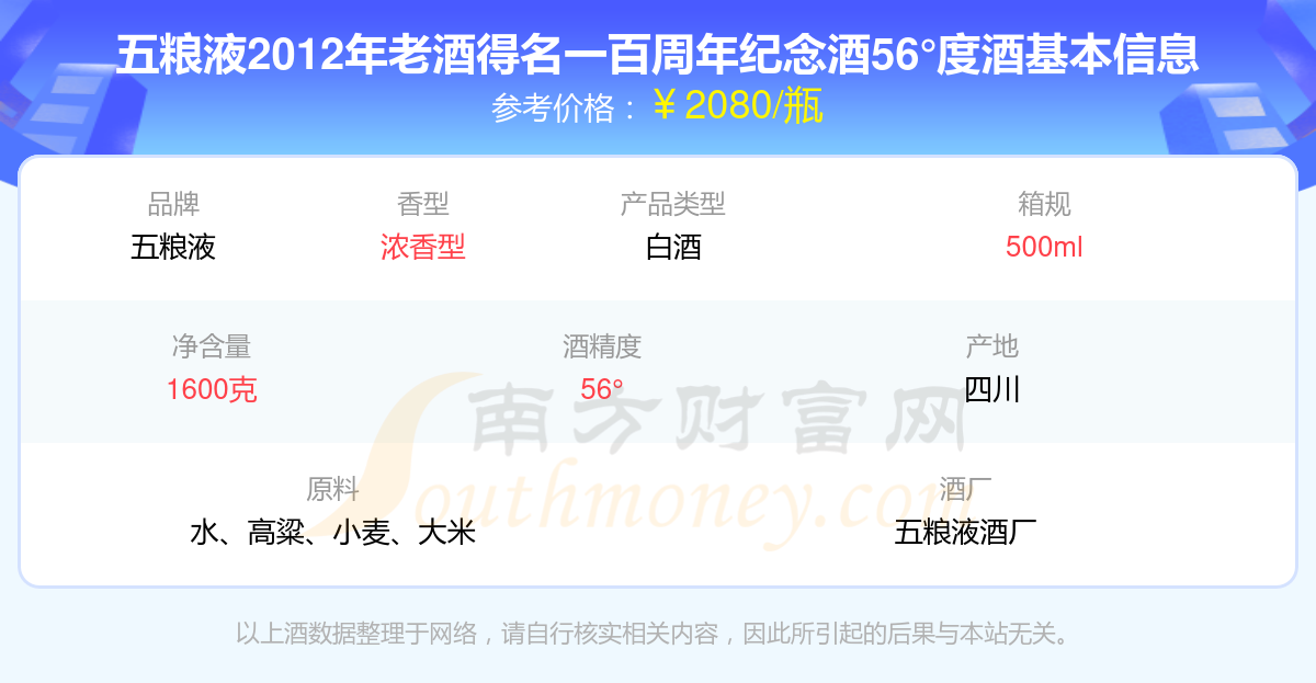 五粮液2012年老酒得名一百周年纪念酒56°度基本信息