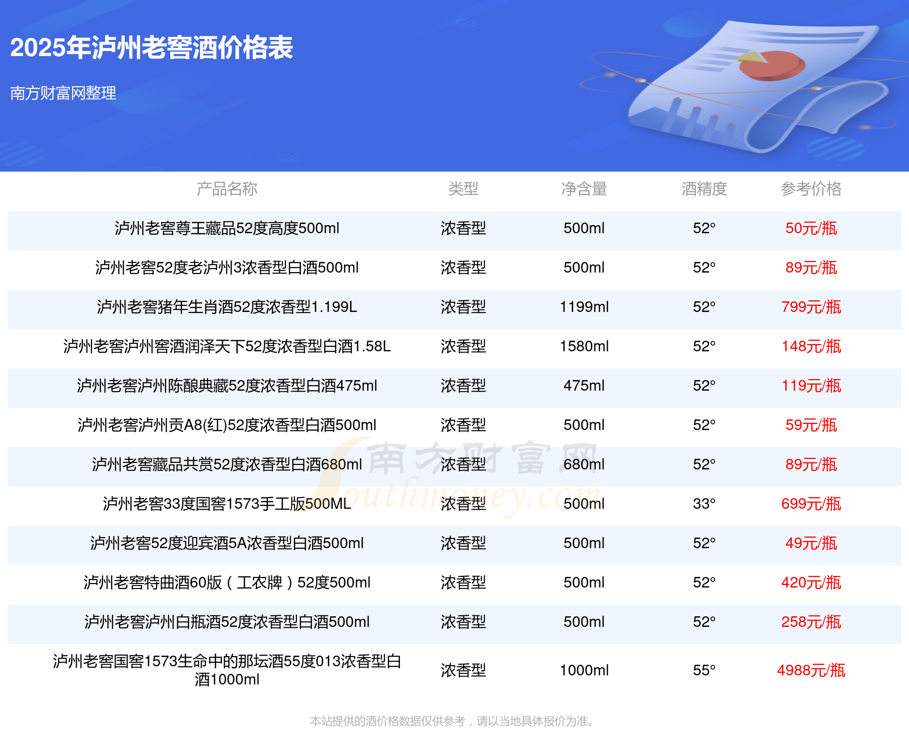 2025年泸州老窖价格最高的酒是泸州老窖国窖1573春酿鼠兆丰年E 55度,参考价17999元/瓶,最低的是泸州老窖45度五洲醉8窖经典小酒版浓香型100ml,参考价10元/瓶,价格高低差为17989元/瓶。