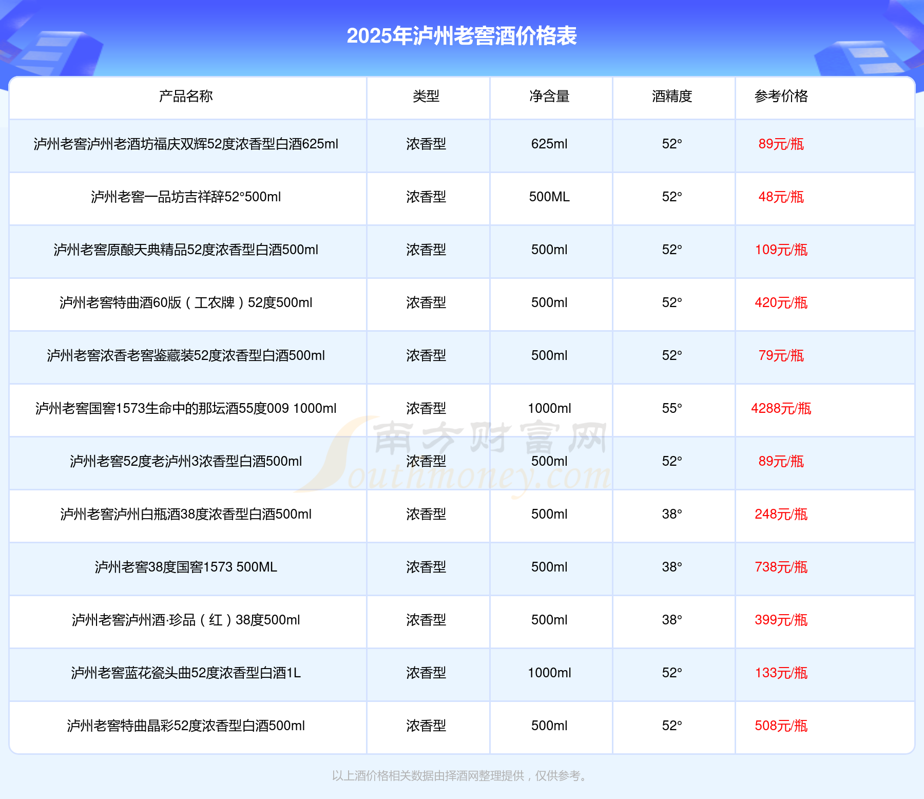2025年,泸州老窖国窖1573春酿鼠兆丰年E 55度、泸州老窖国窖1573生命中的那坛酒55度014、泸州老窖国窖1573春酿鼠兆丰年A 55度、泸州老窖国窖1573生命中的那坛酒55度013浓香型白酒1000ml、泸州老窖国窖1573生命中的那坛酒55度009 1000ml等泸州老窖酒价格如下:
