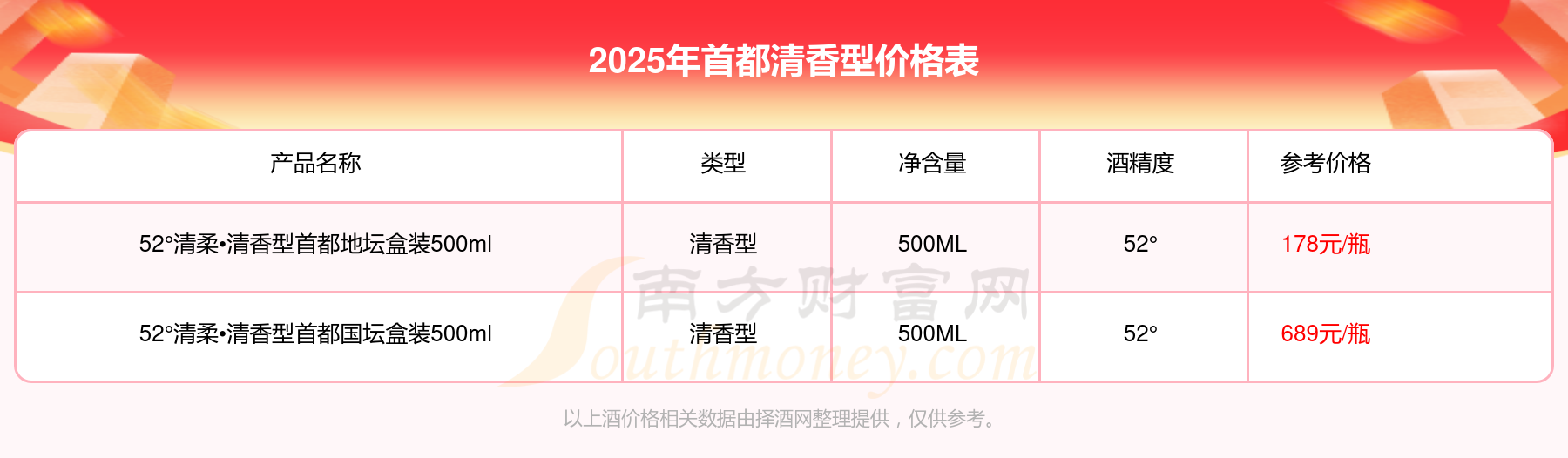 2025年,52°清柔?清香型首都国坛盒装500ml、52°清柔?清香型首都地坛盒装500ml等首都清香型酒参考价格如下:52°清柔?清香型首都国坛盒装500ml参考价689元、52°清柔?清香型首都地坛盒装500ml参考价178元。