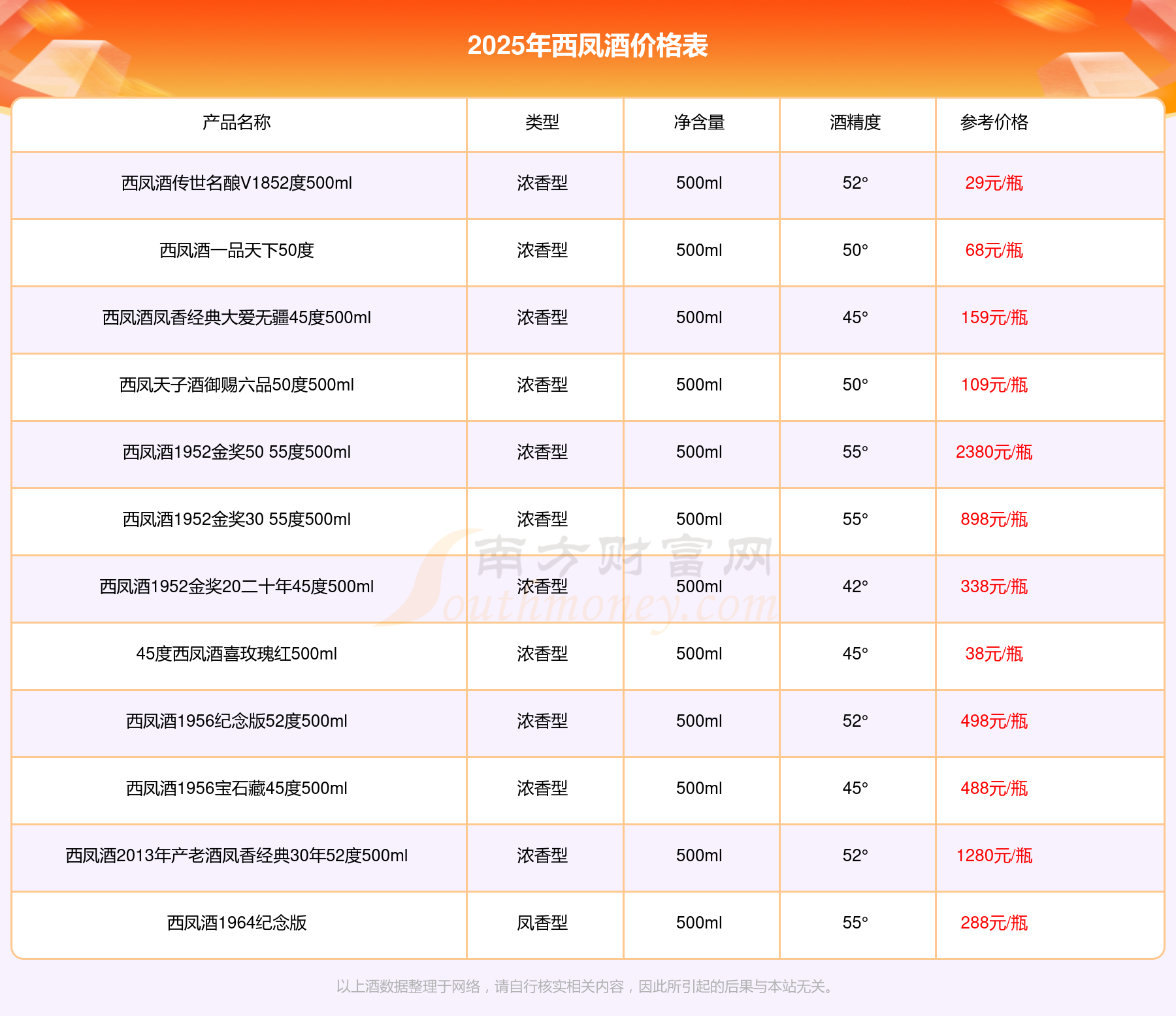 西凤酒 酒海私藏55度3000ml参考价8880元/瓶、西凤酒1952金奖50 55度500ml参考价2380元/瓶、西凤酒2013年产老酒凤香经典30年52度500ml参考价1280元/瓶、西凤酒1956钻石藏45度500ml参考价980元/瓶、西凤酒1952金奖30 55度500ml参考价898元/瓶。