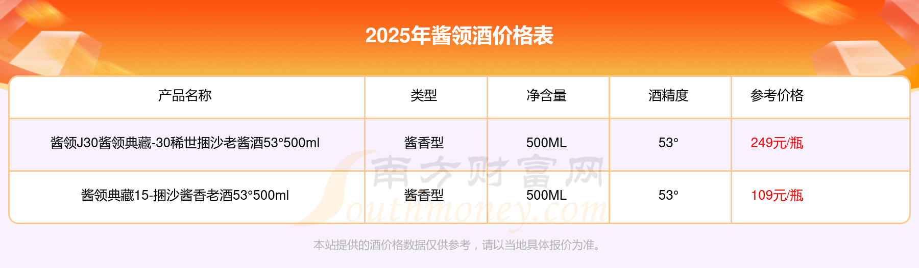 酱领J30酱领典藏-30稀世捆沙老酱酒53°500ml参考价249元/瓶、酱领典藏15-捆沙酱香老酒53°500ml参考价109元/瓶。