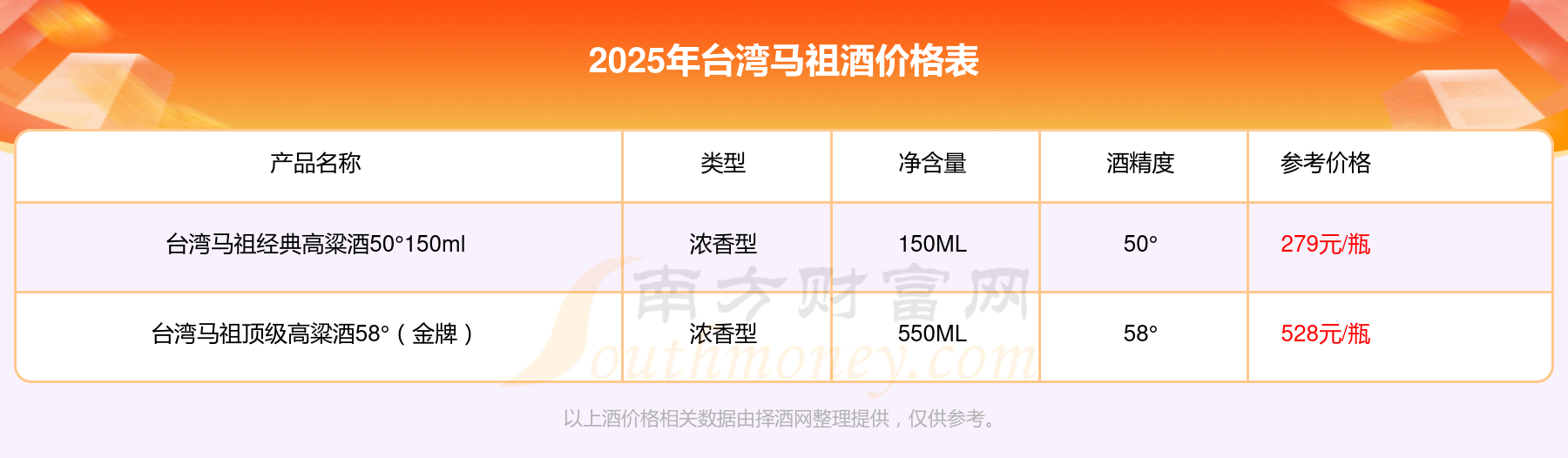 台湾马祖顶级高粱酒58°(金牌)参考价528元/瓶、台湾马祖经典高粱酒50°150ml参考价279元/瓶。