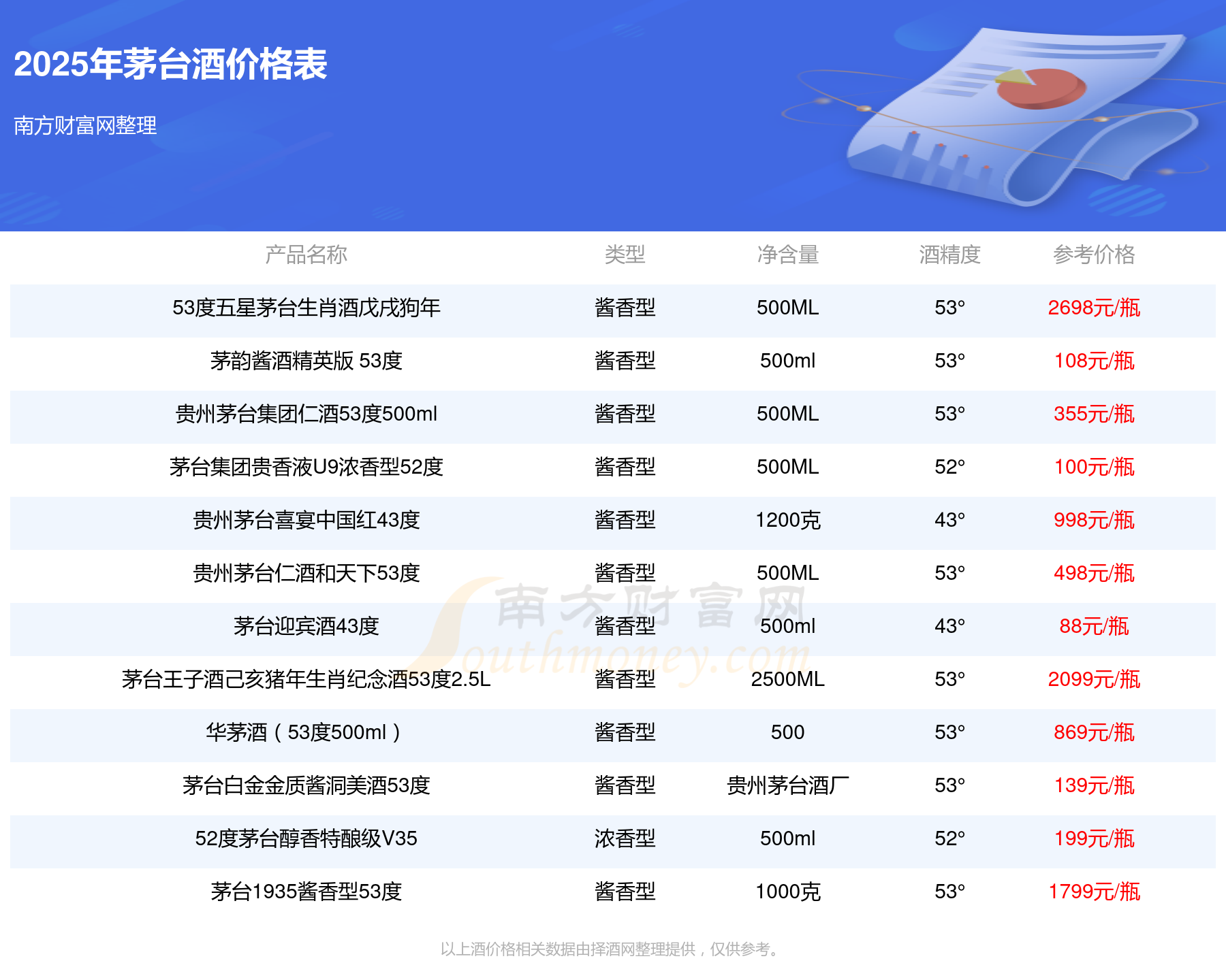 2025年茅台酒华茅鉴藏 酱香型白酒 3L 53°、53度五星茅台生肖酒丁酉鸡年、贵州茅台己亥猪年生肖酒53°500ml、53度五星茅台生肖酒戊戌狗年、飞天茅台53°500ml(2015年)、茅台王子酒己亥猪年生肖纪念酒53度2.5L、茅台1935酱香型53度等最新价格如下:华茅鉴藏 酱香型白酒 3L 53°参考价8388元/瓶、53度五星茅台生肖酒丁酉鸡年参考价2798元/瓶、贵州茅台己亥猪年生肖酒53°500ml参考价2699元/瓶、53度五星茅台生肖酒戊戌狗年参考价2698元/瓶、飞天茅台53°500ml(2015年)参考价2199元/瓶、茅台王子酒己亥猪年生肖纪念酒53度2.5L参考价2099元/瓶、茅台1935酱香型53度参考价1799元/瓶。