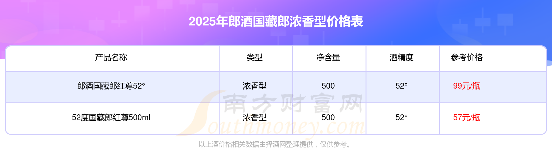郎酒国藏郎红尊52°参考价99元/瓶、52度国藏郎红尊500ml参考价57元/瓶。