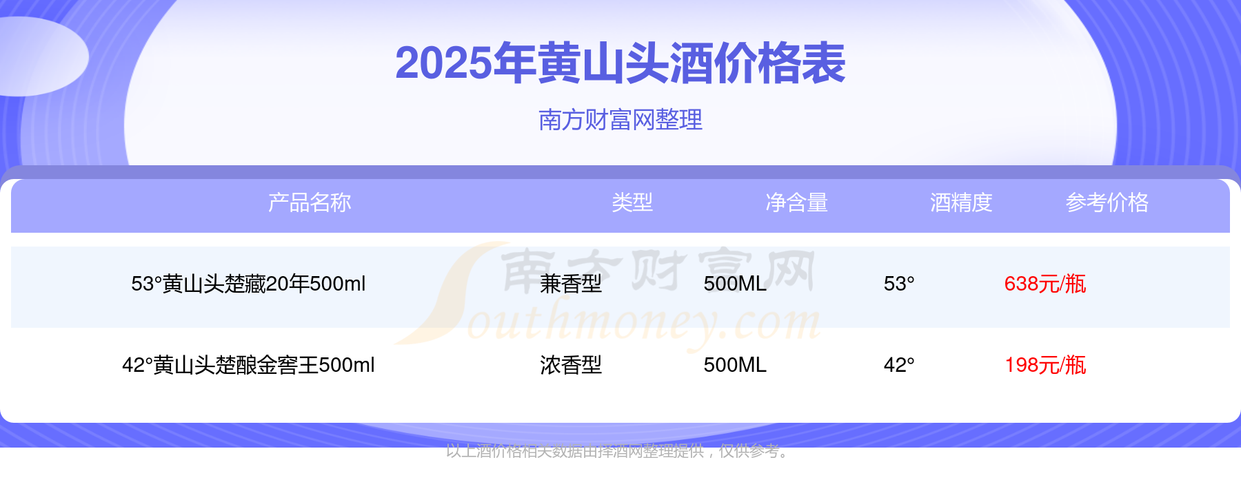 2025年黄山头酒53°黄山头楚藏20年500ml、42°黄山头楚酿金窖王500ml等最新价格如下:53°黄山头楚藏20年500ml参考价638元/瓶、42°黄山头楚酿金窖王500ml参考价198元/瓶。