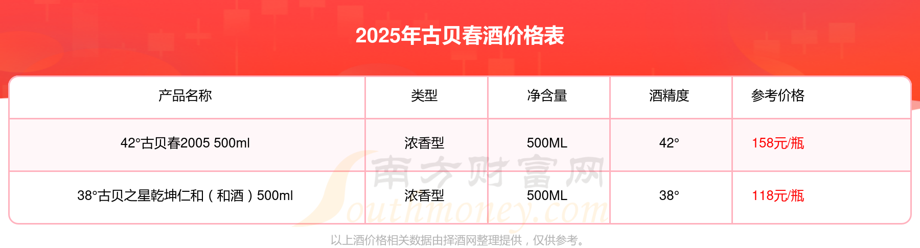 2025年,42°古贝春2005 500ml、38°古贝之星乾坤仁和(和酒)500ml等古贝春酒价格如下:42°古贝春2005 500ml参考价158元/瓶、38°古贝之星乾坤仁和(和酒)500ml参考价118元/瓶。