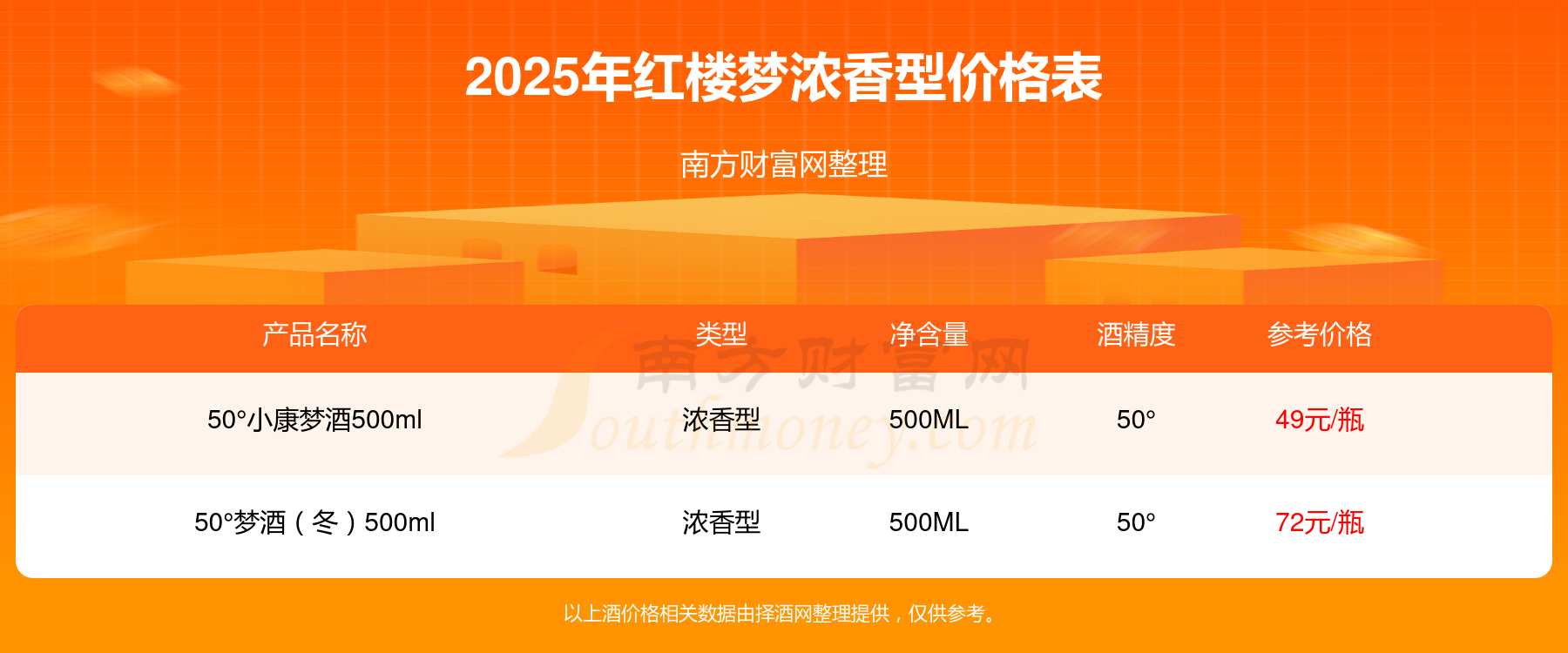 2025年,50°梦酒(冬)500ml、50°小康梦酒500ml等红楼梦浓香型酒价格如下:50°梦酒(冬)500ml参考价72元/瓶、50°小康梦酒500ml参考价49元/瓶。