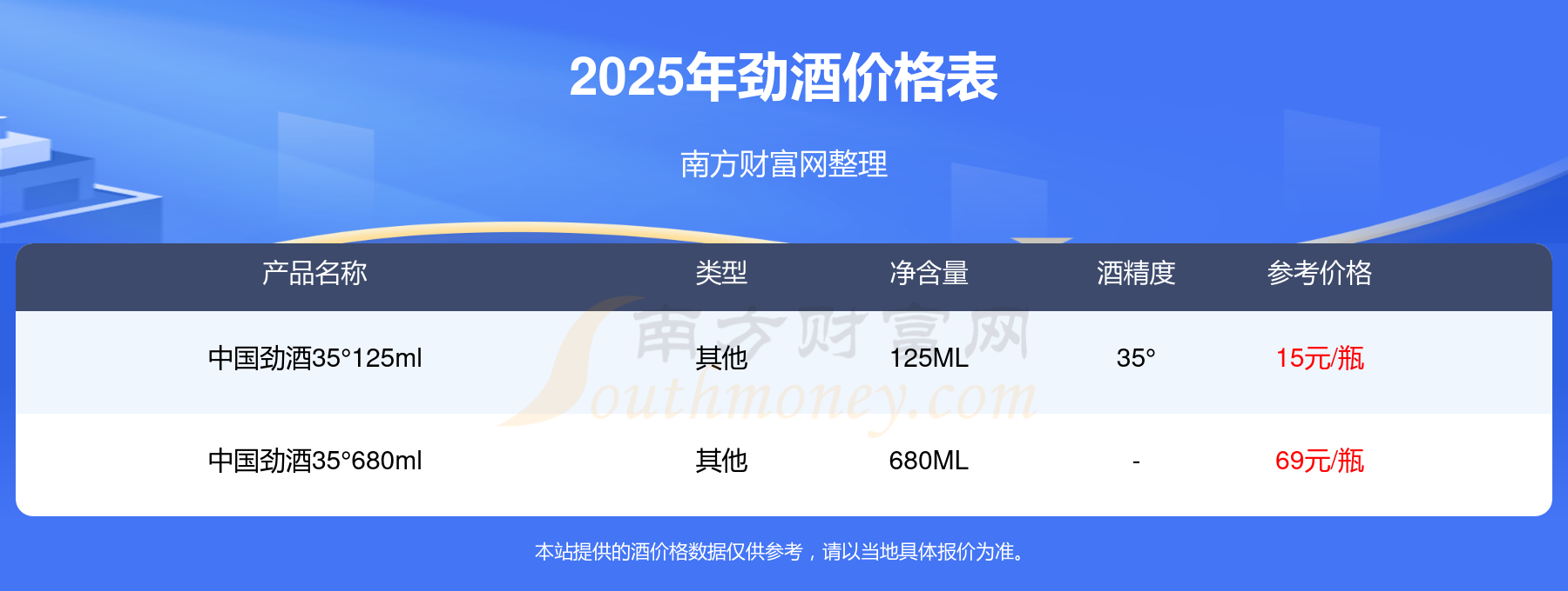 2025年,中国劲酒35°680ml、中国劲酒35°125ml等劲酒价格如下: