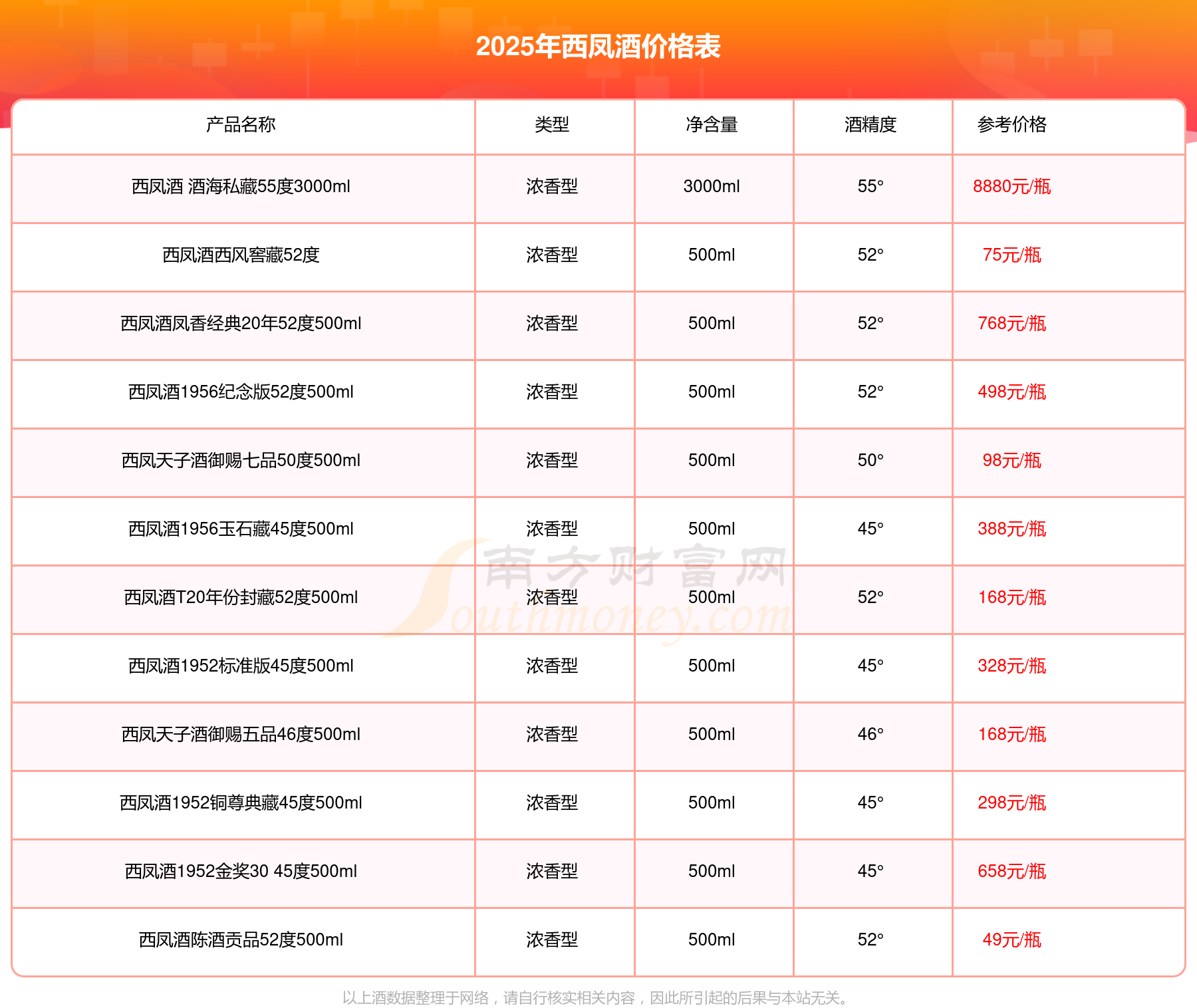 西凤酒 酒海私藏55度3000ml参考价8880元/瓶、西凤酒1952金奖50 55度500ml参考价2380元/瓶、西凤酒2013年产老酒凤香经典30年52度500ml参考价1280元/瓶、西凤酒1956钻石藏45度500ml参考价980元/瓶、西凤酒1952金奖30 55度500ml参考价898元/瓶、西凤酒凤香经典20年52度500ml参考价768元/瓶、西凤酒1952金奖30 45度500ml参考价658元/瓶、西凤酒1956纪念版52度500ml参考价498元/瓶。
