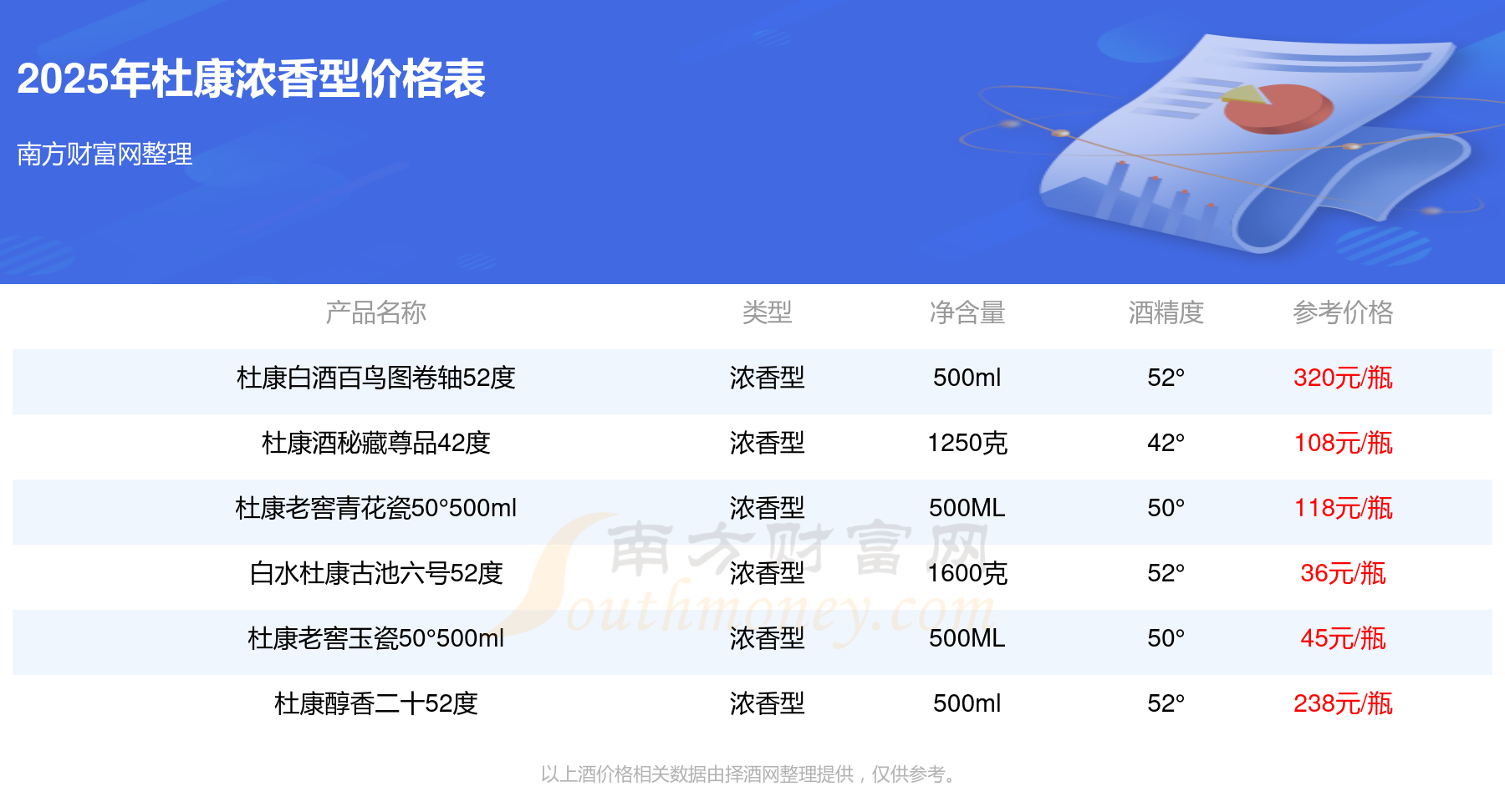 2025年,杜康白酒百鸟图卷轴52度、杜康醇香二十52度、杜康老窖青花瓷50°500ml、杜康酒秘藏尊品42度等杜康浓香型酒价格如下: