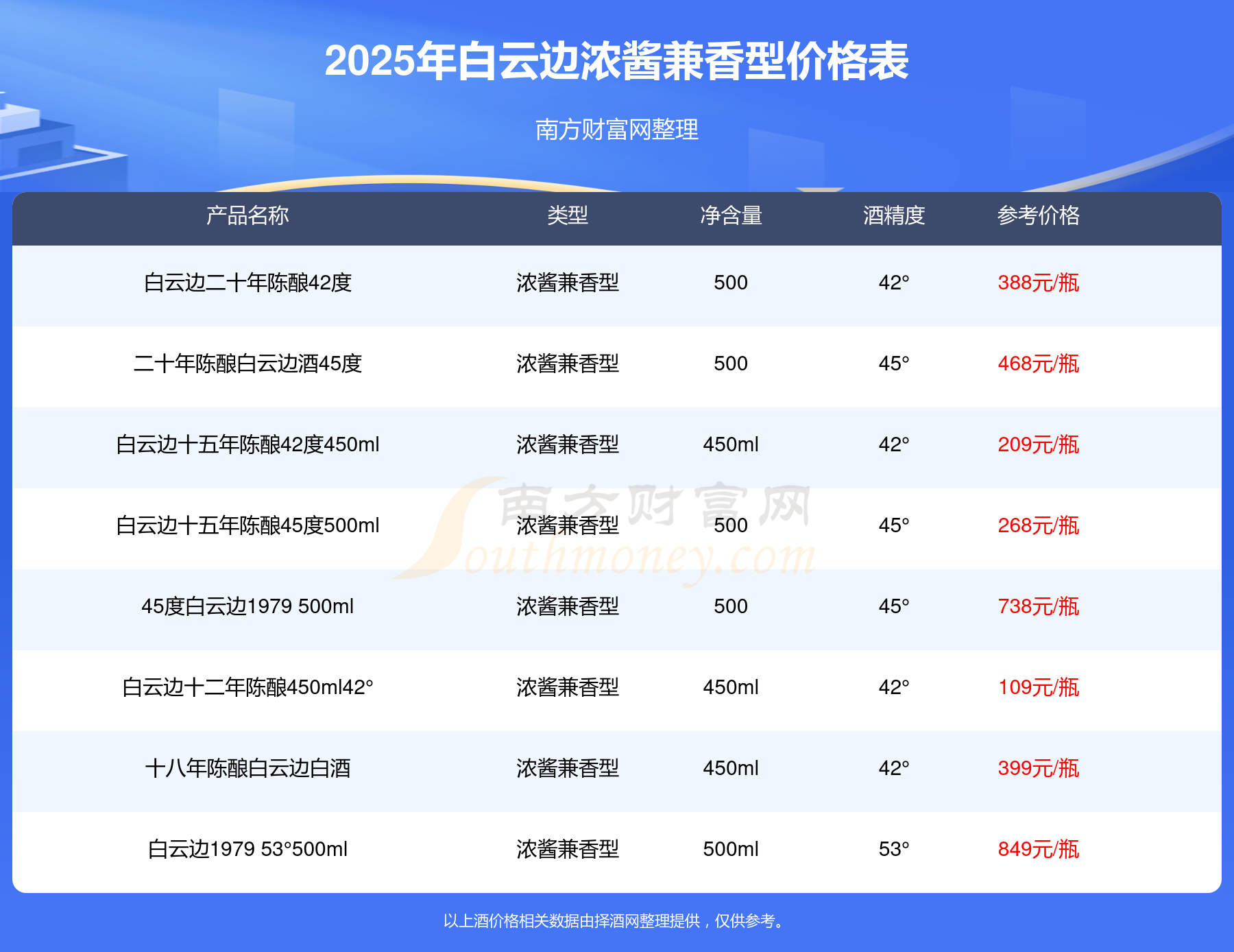 2025年白云边浓酱兼香型酒白云边1979 53°500ml、45度白云边1979 500ml、二十年陈酿白云边酒45度、十八年陈酿白云边白酒、白云边二十年陈酿42度、白云边十五年陈酿45度500ml、白云边十五年陈酿42度450ml等最新价格如下:白云边1979 53°500ml参考价849元/瓶、45度白云边1979 500ml参考价738元/瓶、二十年陈酿白云边酒45度参考价468元/瓶、十八年陈酿白云边白酒参考价399元/瓶、白云边二十年陈酿42度参考价388元/瓶、白云边十五年陈酿45度500ml参考价268元/瓶、白云边十五年陈酿42度450ml参考价209元/瓶。