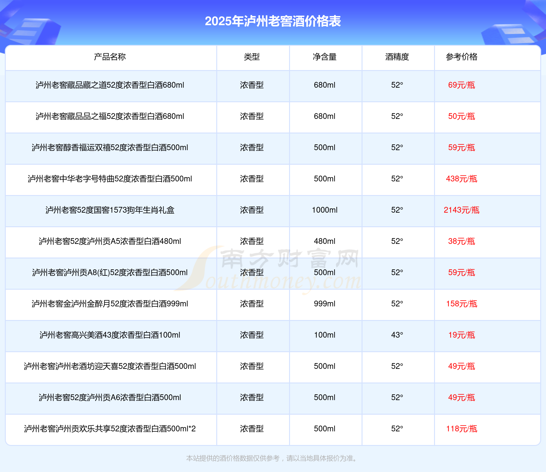 泸州老窖酒最新价格2025:泸州老窖国窖1573春酿鼠兆丰年E 55度参考价17999元/瓶、泸州老窖国窖1573生命中的那坛酒55度014参考价9999元/瓶、泸州老窖国窖1573春酿鼠兆丰年A 55度参考价5088元/瓶、泸州老窖国窖1573生命中的那坛酒55度013浓香型白酒1000ml参考价4988元/瓶、泸州老窖国窖1573生命中的那坛酒55度009 1000ml参考价4288元/瓶、泸州老窖国窖1573中国品味52度浓香型白酒500ml参考价2888元/瓶、泸州老窖国窖1573许燎源概念作品58度浓香型白酒1000ml参考价2680元/瓶。
