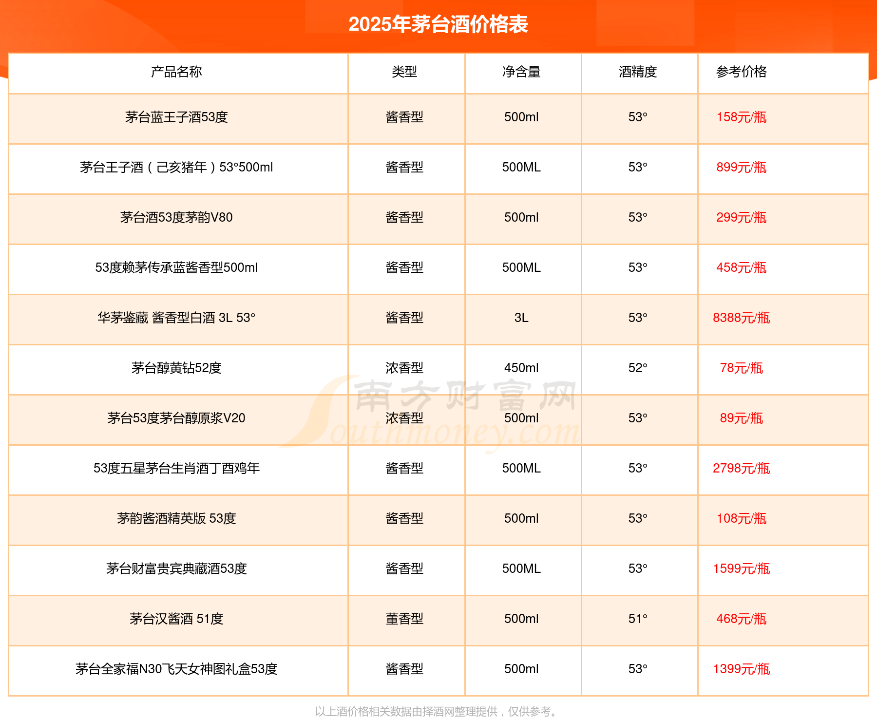 2025年,华茅鉴藏 酱香型白酒 3L 53°、53度五星茅台生肖酒丁酉鸡年、贵州茅台己亥猪年生肖酒53°500ml、53度五星茅台生肖酒戊戌狗年、飞天茅台53°500ml(2015年)、茅台王子酒己亥猪年生肖纪念酒53度2.5L、茅台1935酱香型53度、茅台财富贵宾典藏酒53度等茅台酒价格如下:华茅鉴藏 酱香型白酒 3L 53°参考价8388元/瓶、53度五星茅台生肖酒丁酉鸡年参考价2798元/瓶、贵州茅台己亥猪年生肖酒53°500ml参考价2699元/瓶、53度五星茅台生肖酒戊戌狗年参考价2698元/瓶、飞天茅台53°500ml(2015年)参考价2199元/瓶、茅台王子酒己亥猪年生肖纪念酒53度2.5L参考价2099元/瓶、茅台1935酱香型53度参考价1799元/瓶、茅台财富贵宾典藏酒53度参考价1599元/瓶。