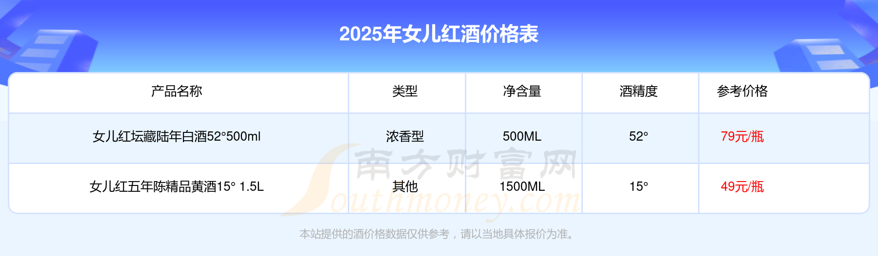 2025年,女儿红坛藏陆年白酒52°500ml、女儿红五年陈精品黄酒15° 1.5L等女儿红酒价格如下:女儿红坛藏陆年白酒52°500ml参考价79元/瓶、女儿红五年陈精品黄酒15° 1.5L参考价49元/瓶。