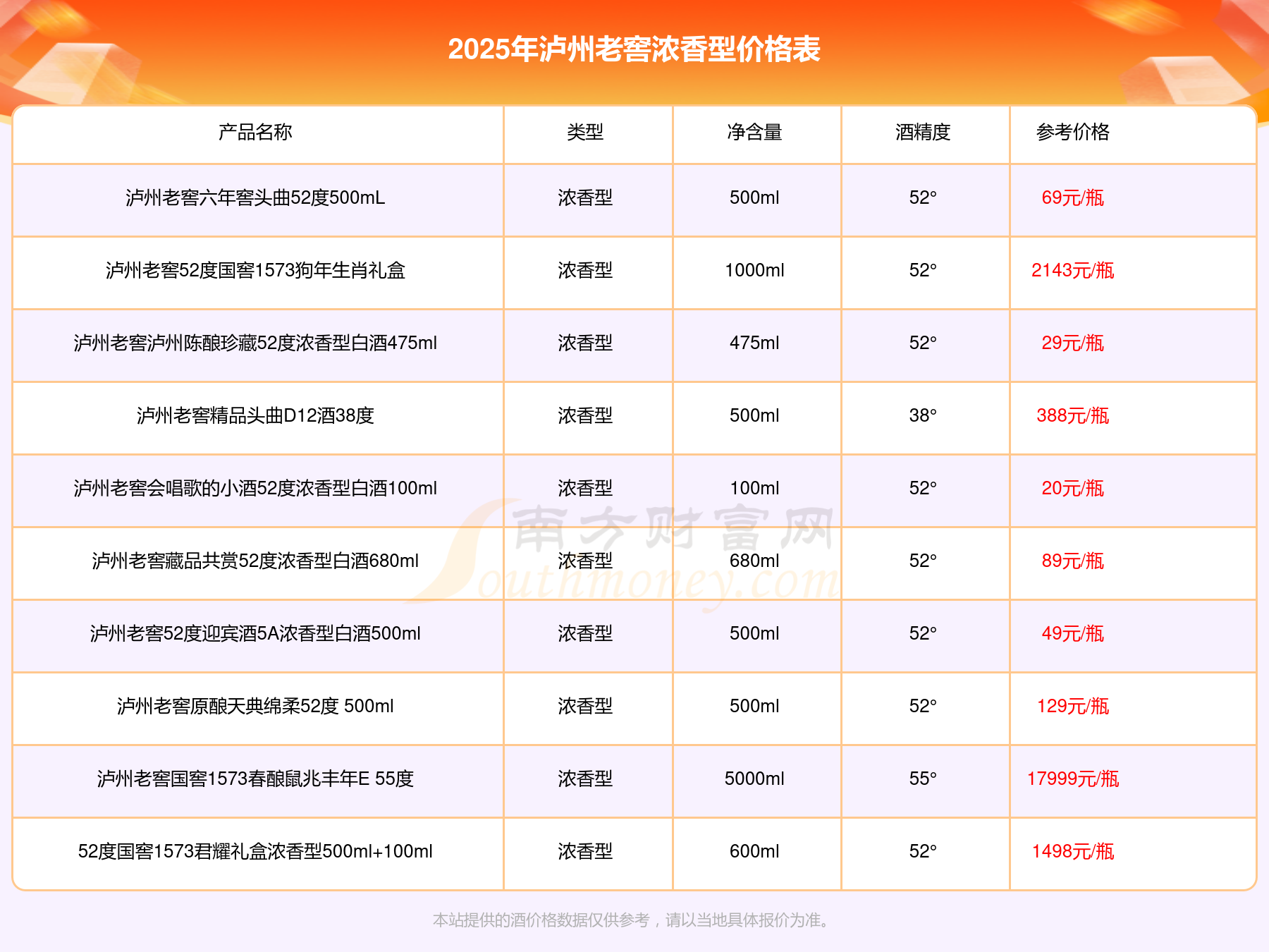 泸州老窖国窖1573春酿鼠兆丰年E 55度参考价17999元/瓶、泸州老窖国窖1573生命中的那坛酒55度014参考价9999元/瓶、泸州老窖国窖1573春酿鼠兆丰年A 55度参考价5088元/瓶、泸州老窖国窖1573生命中的那坛酒55度013浓香型白酒1000ml参考价4988元/瓶、泸州老窖国窖1573生命中的那坛酒55度009 1000ml参考价4288元/瓶、泸州老窖国窖1573中国品味52度浓香型白酒500ml参考价2888元/瓶。